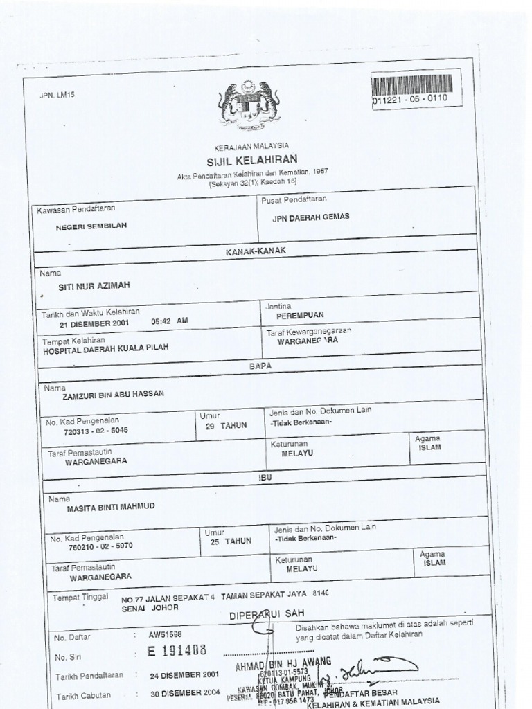 No Sijil Lahir Pada Surat Beranak Macam Contoh Sijil